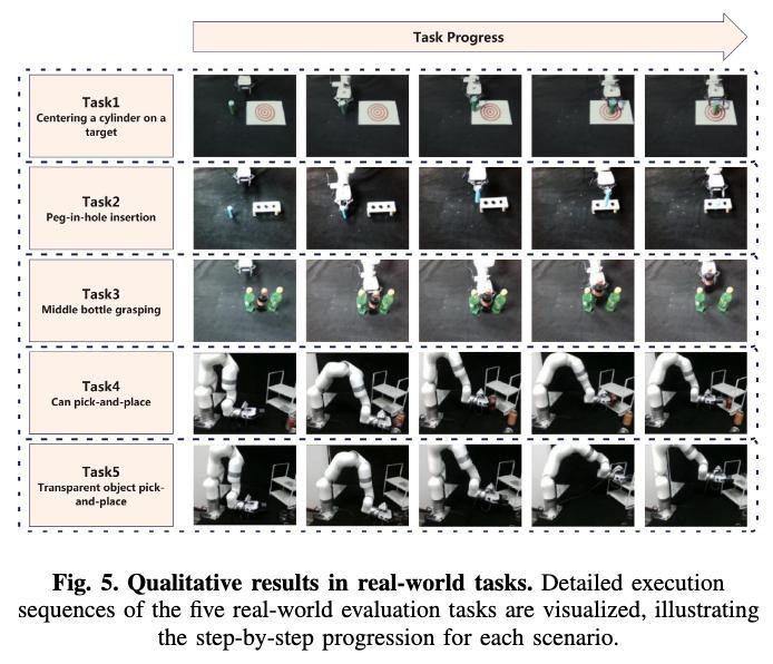 在真机实验部分,实验设计五个空间感知要求高的真实机器人任务,包括目标居中放置、插孔、密集抓取、置物架放置及透明物体操作等。所有任务均对空间精度容忍度极低。