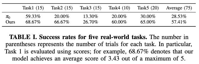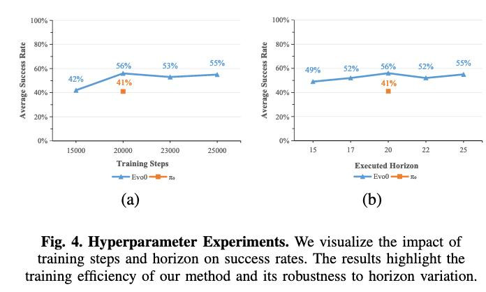 值得注意的是,仅用15k步训练的Evo-0已经超过了用20k步训练的π0,这表明Evo-0具有更高的训练效率。