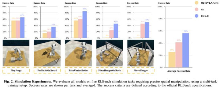 在rlbench仿真实验中,Evo-0在5个需要精细操作的任务上,平均成功率超过基线pi0 15%,超过openvla-oft 31%。